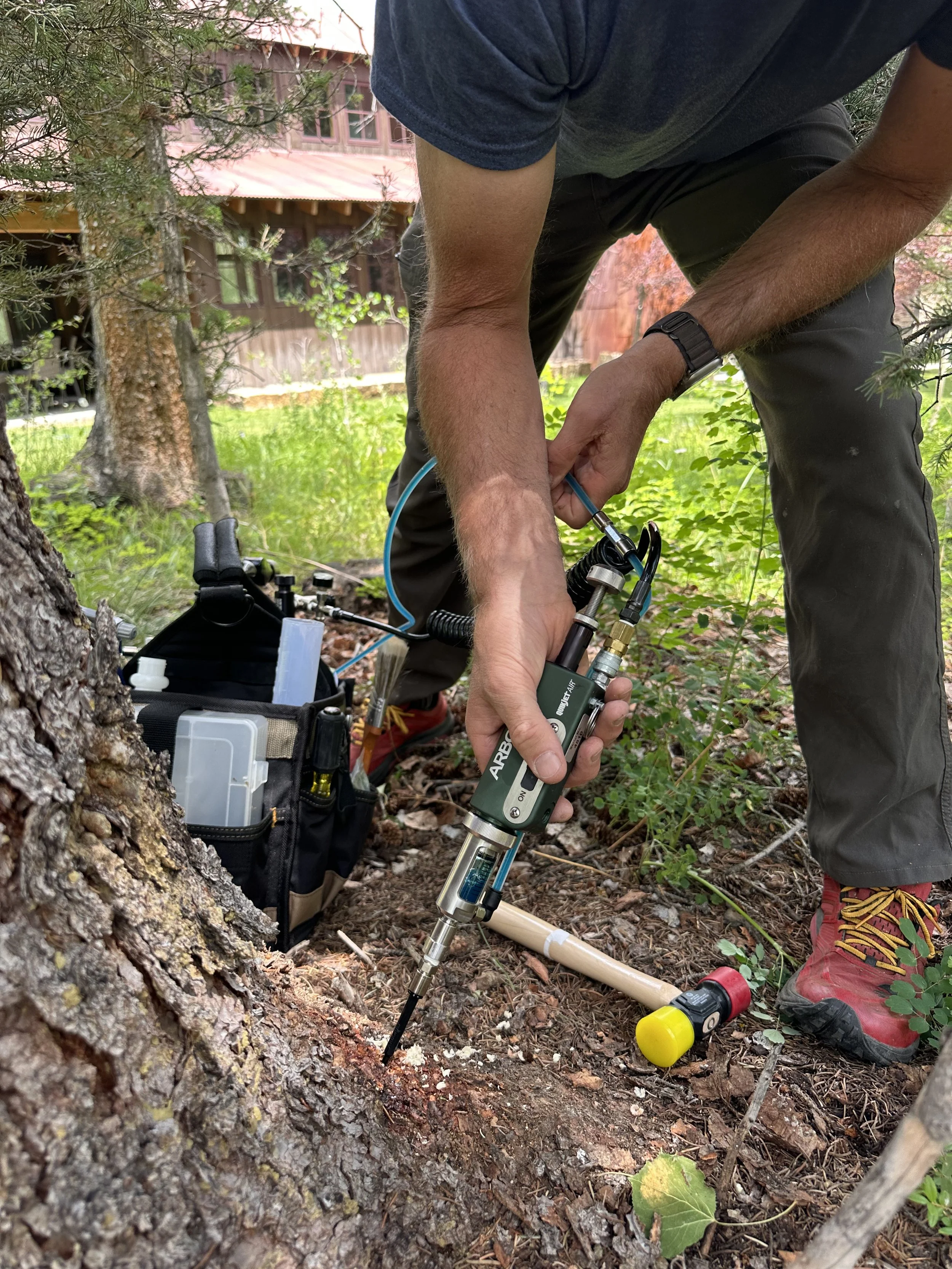 Compost tea starts with high quality compost steeped in water to extract water soluble nutrients, humic acid including beneficial bacteria, mycorrhizae, and nematodes. Most landscape and tree services apply their compost tea using a surface broadcast method (root drench, foliar spray, or hose application). We introduce a concentrated dose directly into the soil root zone via an injection device to prevent the drying out of the live biological components on the surface that are otherwise exposed to high altitude UV and dry air. Injecting into the root zone also prevents runoff on the often poor, rocky, compacted, disturbed, often desiccated mountain soils. In the soil, the microbes break up compacted soil, improve soil structure, and creates pore space for water and oxygen to migrate throughout. This helps the soil retain more water, makes more nutrients available through symbiotic relationships between the trees and mycorrhizae which encourages tree root expansion and restores the soil’s natural biology. An additional boost of species and region specific mycorrhizae can be added to increase these benefits and target species specific symbiotic relationships and health.